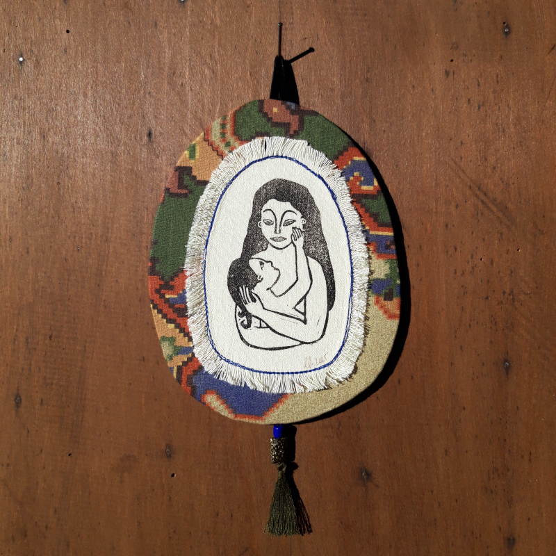 Réalisé à partir d’une impression de linogravure sur tissu, rendue rigide à l’aide d’une structure en carton entre les parties textiles. Les matières, couleurs et assemblages varient, rendant chaque oratoire unique.