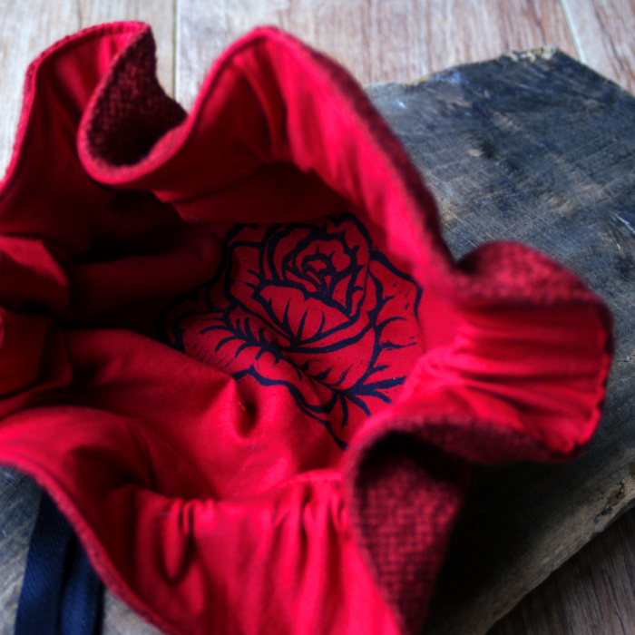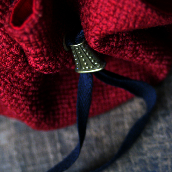 Ce petit sac se ferme à l’aide d’un lien en coton qui coulisse dans une jolie breloque en laiton.