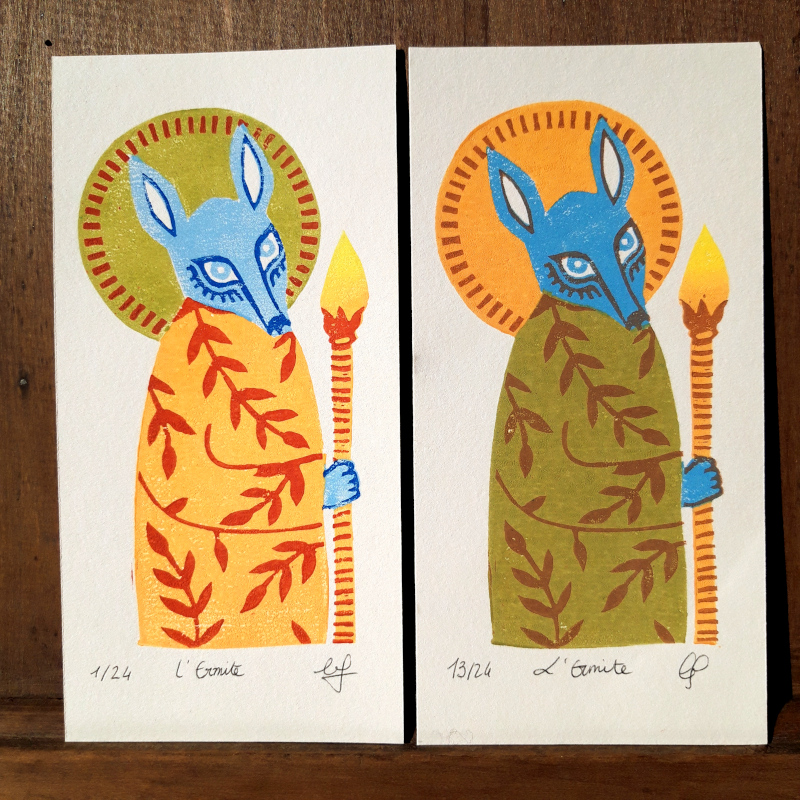 Linogravure dite « à plaque perdue », imprimée en 24 exemplaires ( 2 coloris disponibles ).