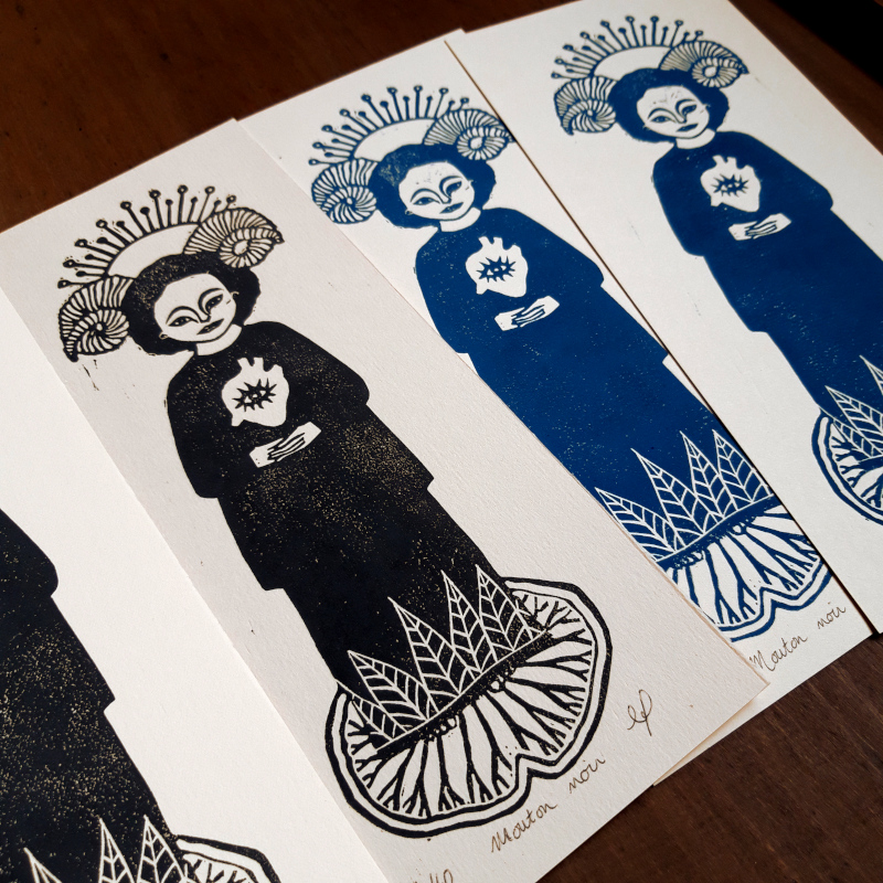 Chaque impression est réalisée selon un procédé artisanal, ce qui fait de chacune d’elles un tirage unique. Ainsi il est possible que votre impression soit légèrement différente de la photo, c’est là un des charmes de la linogravure.